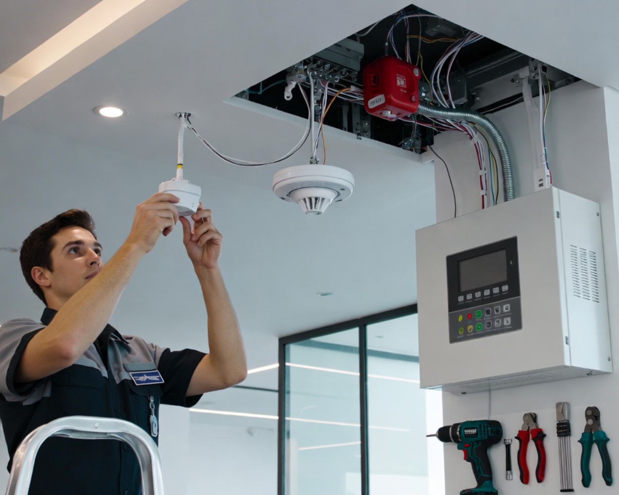 We provide complete fire alarm systems including control panels, smoke and heat detectors, manual call points, sounders, and cabling. The system will be installed, tested, and commissioned in compliance with civil defense and project specifications.